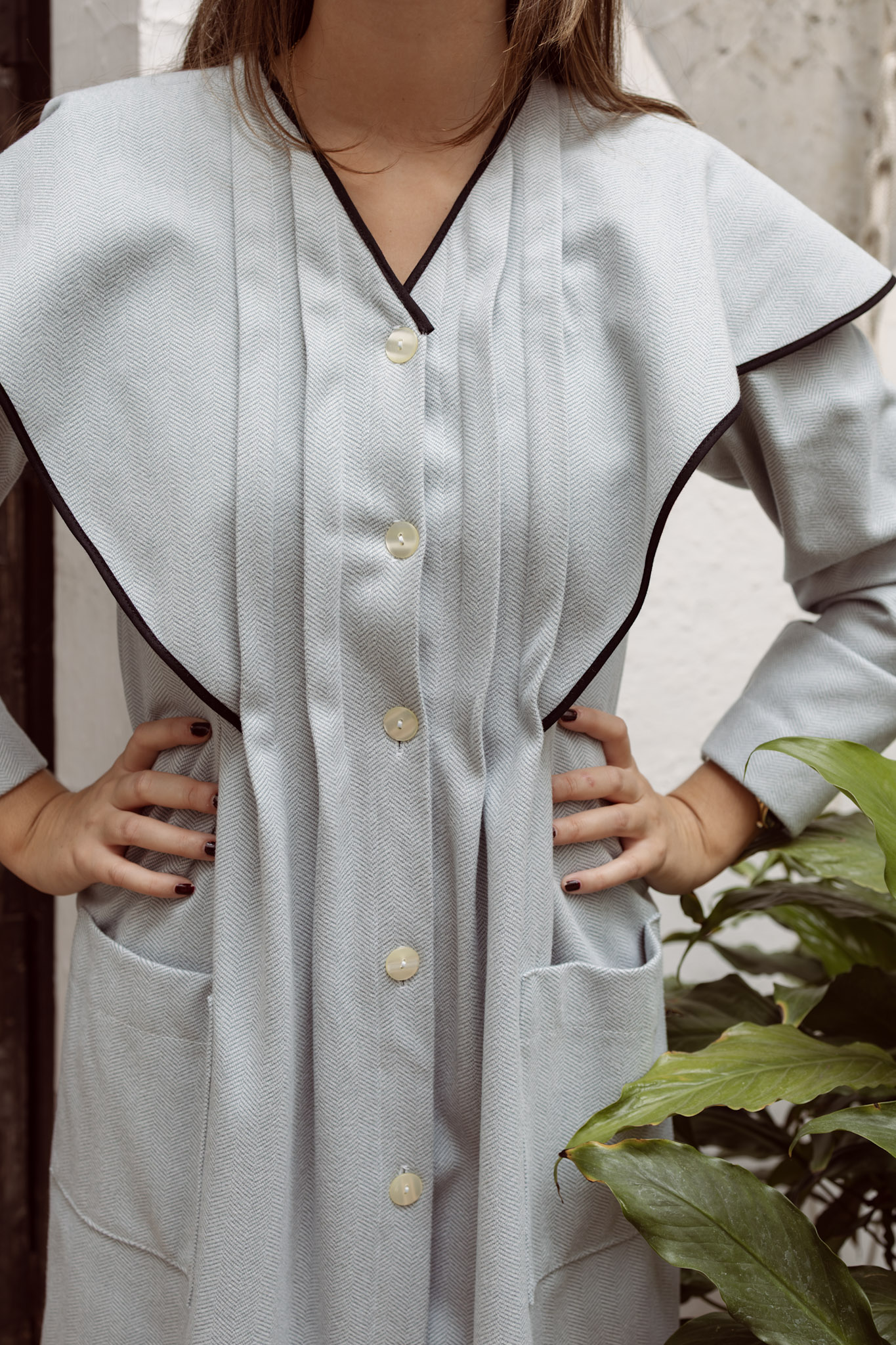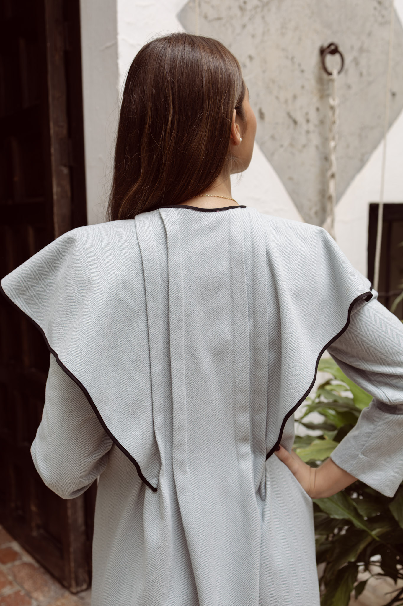 Bata confeccionada en lana, con alas en los hombros y tablas a los lados de la abotonadura.