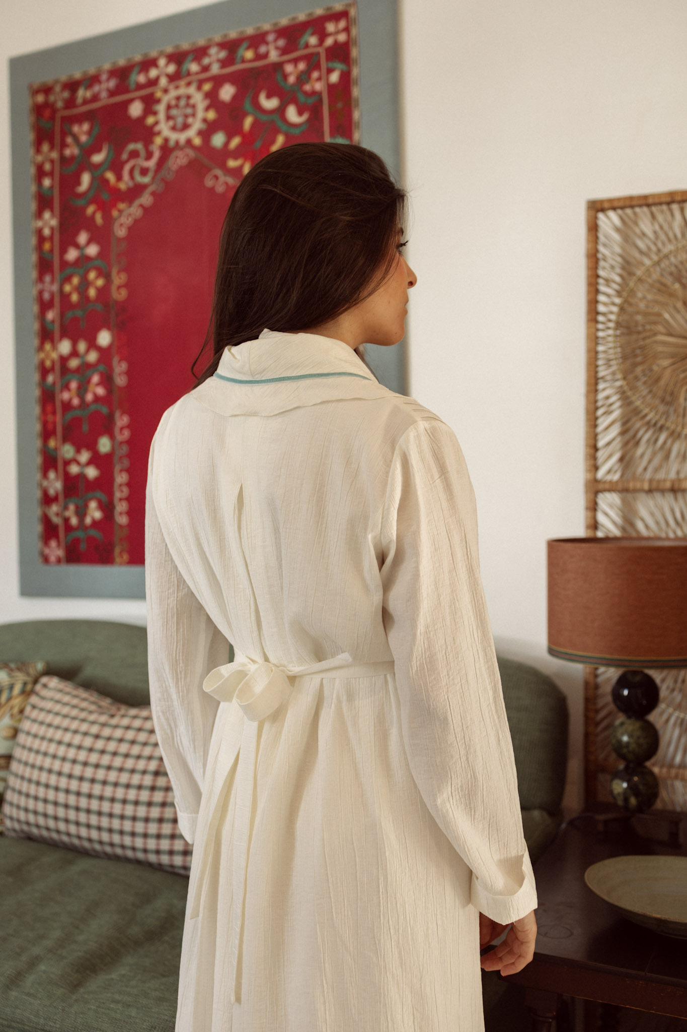 Bata confeccionada en crepé de microfibra granulada. Destaca su cuello esmoquin, rematado con un volante al bies del mismo tejido y un adorno de terciopelo celeste que añade contraste y elegancia. Un lazo en la cintura permite entallar la espalda, consiguiendo una silueta armoniosa y femenina.