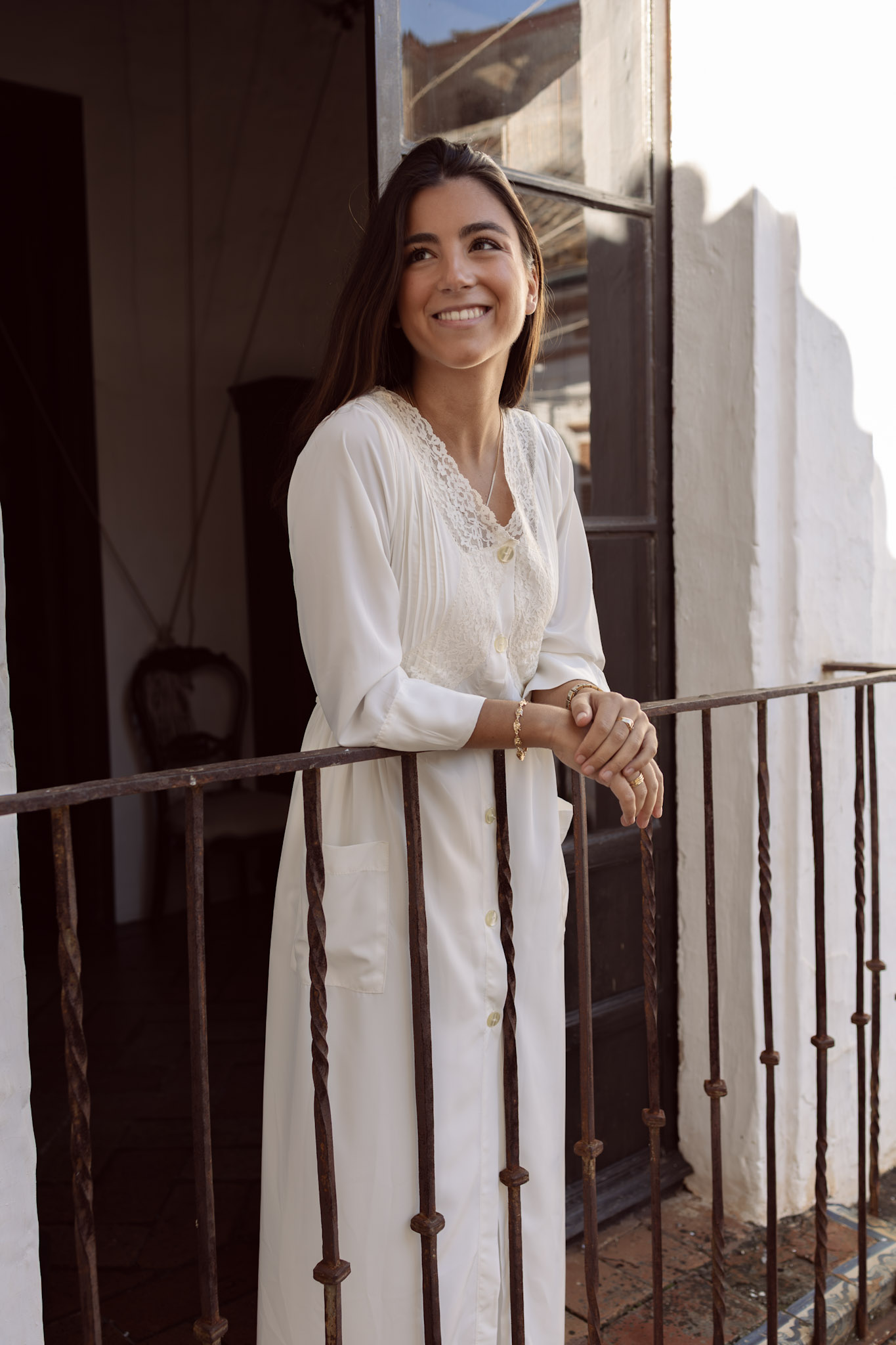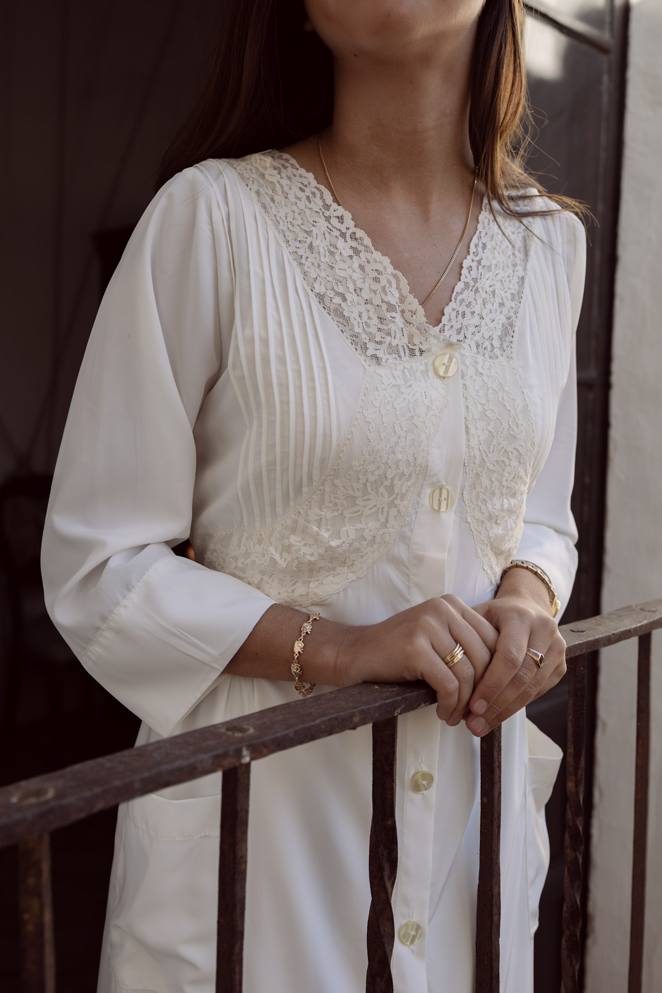 Bata hecha en microfibra, abrochada en medio, con tablitas y encajes en redondo. Manga Francesa y lazo en los costados para atar atrás y entallar la cintura.