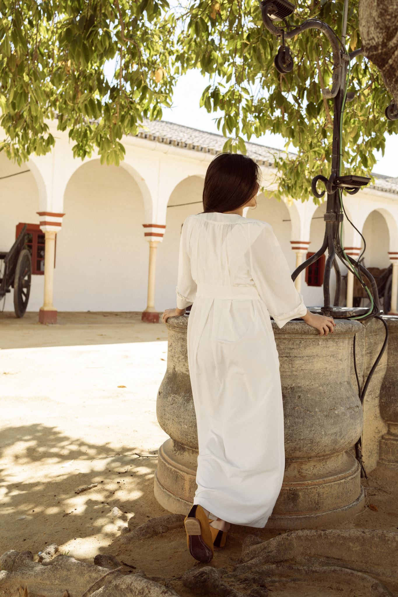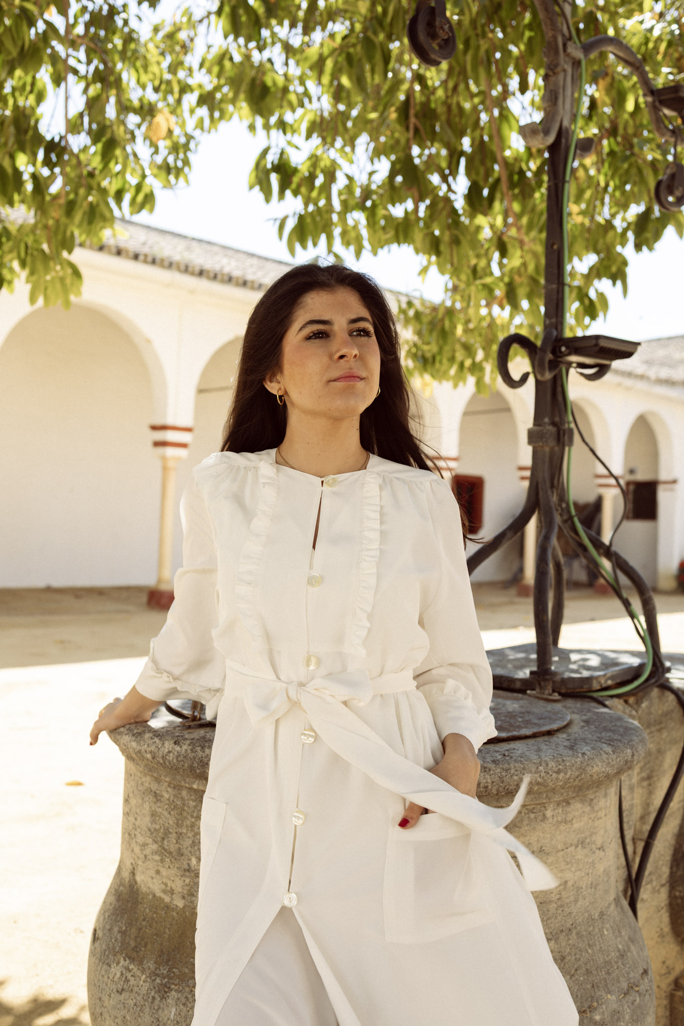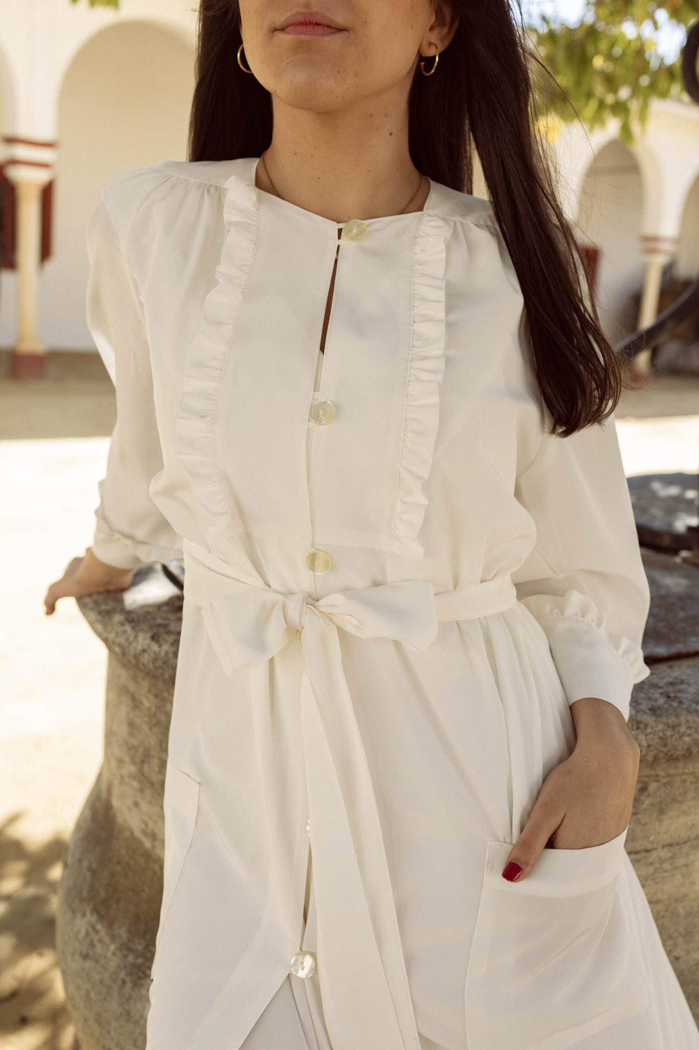 Bata confeccionada en seda de microfibra, un tejido suave, ligero y con una caída elegante. Diseño de línea recta con cierre frontal mediante botones y travillas, que aporta un acabado delicado y especial. Presenta un canesú delantero con volante fruncido, aportando un aire romántico. El hombro ligeramente fruncido crea una sutil forma abullonada en la manga, rematada en puño con el mismo volante, dando continuidad al diseño y un acabado armonioso. En la parte trasera, incorpora tres pinzas en la espalda, que entallan la prenda y estilizan la silueta sin perder comodidad. Se completa con bolsillos laterales, combinando funcionalidad y elegancia.
