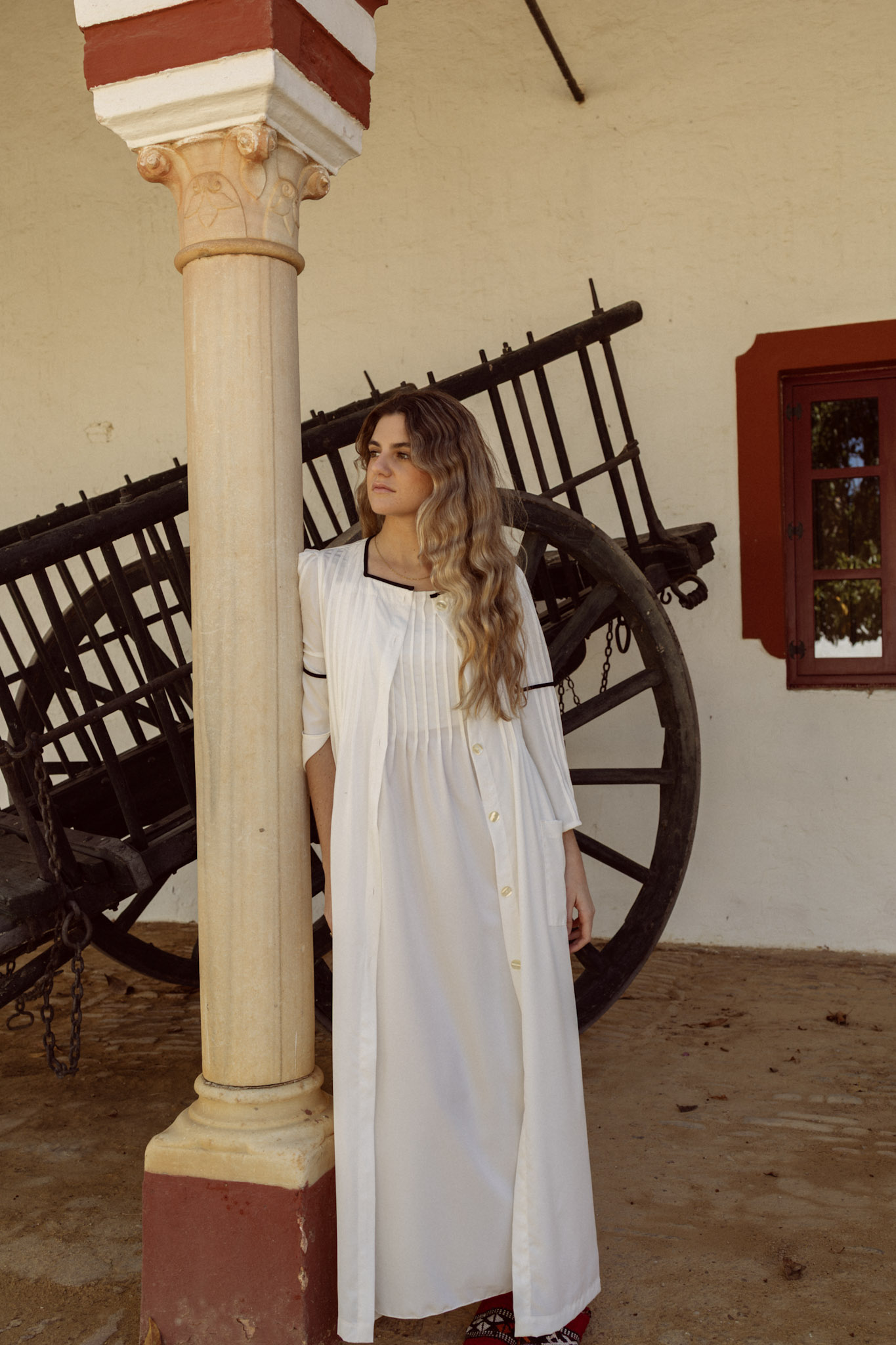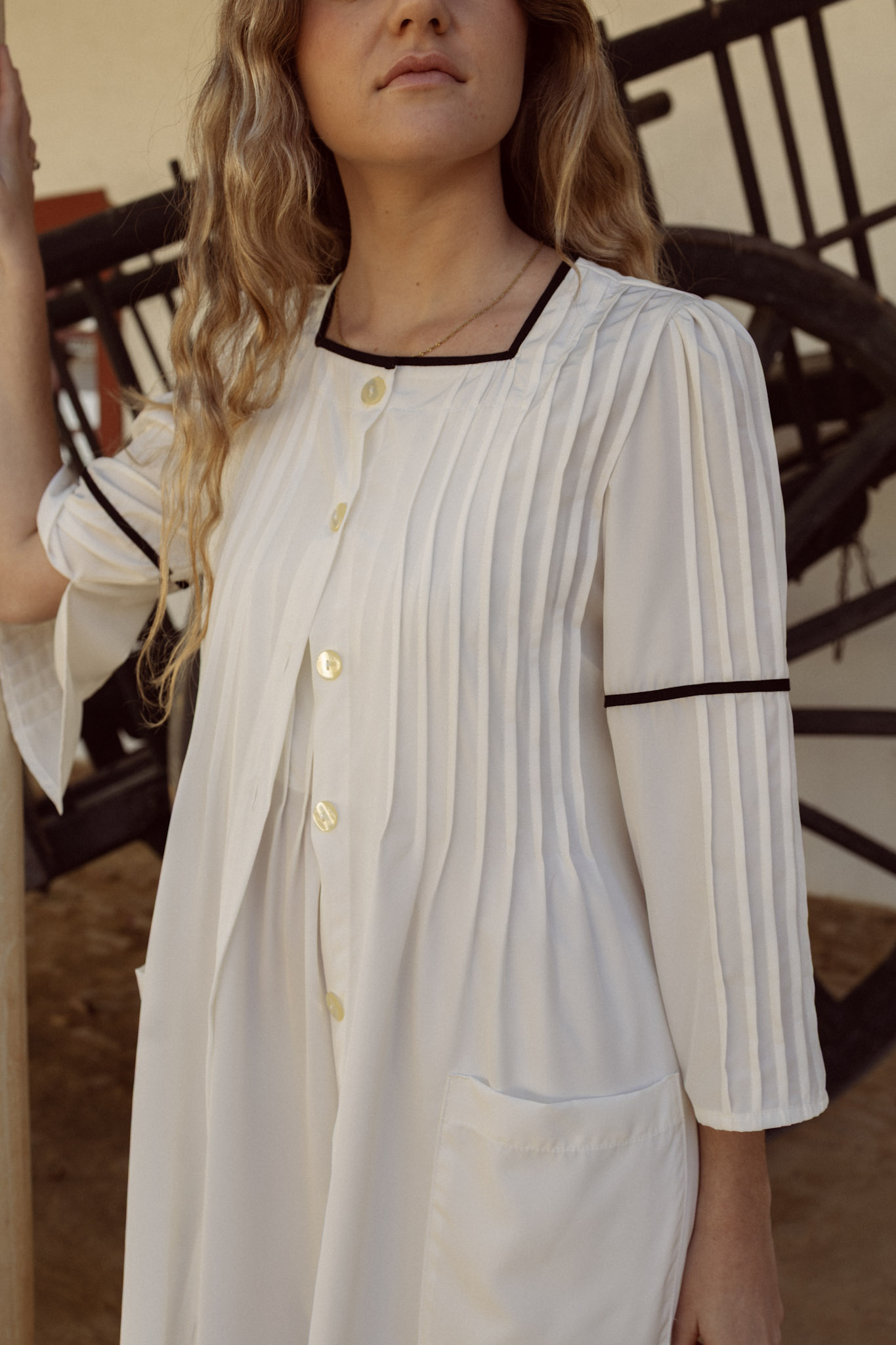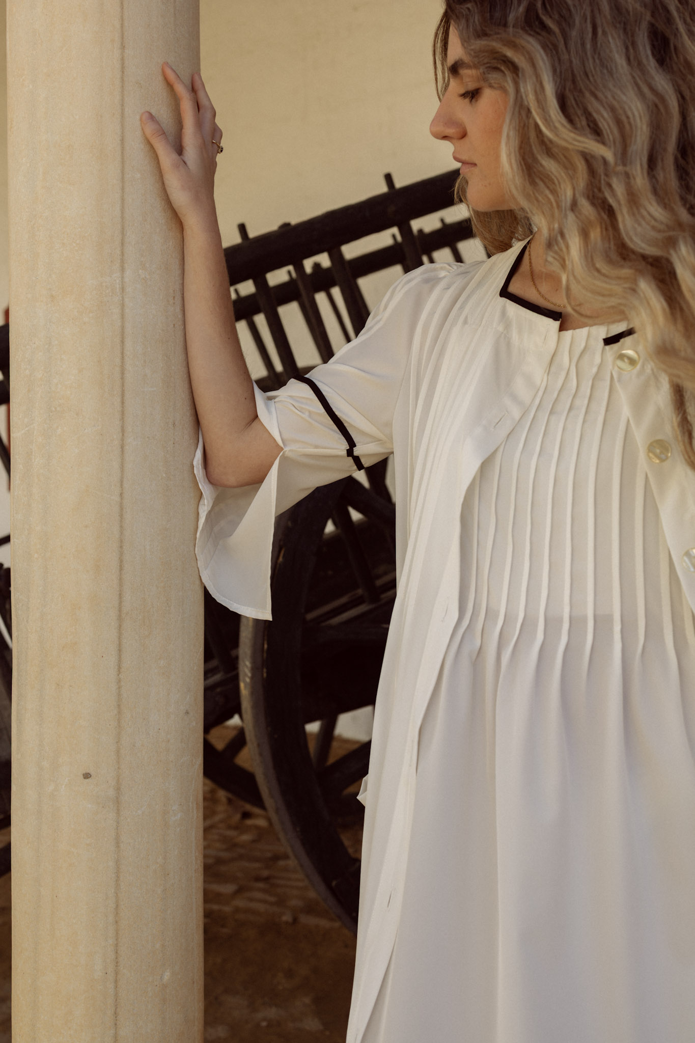 Bata confeccionada en seda de microfibra, un tejido que combina un tacto sedoso y una caída fluida con gran resistencia a las arrugas. El diseño destaca por su pechera adornada con tablas plisadas verticales a ambos lados, aportando textura. Presenta un escote cuadrado enmarcado por un sutil vivo negro en contraste, detalle que se repite en el cierre central de botones de nácar y en las mangas. Incorpora mangas largas acampanadas con un corte a la altura del codo resaltado por el vivo negro, y dos prácticos bolsillos de parche delanteros. El diseño de la espalda incluye tres pinzas de entalle que definen suavemente la silueta, logrando un ajuste impecable y estilizado.