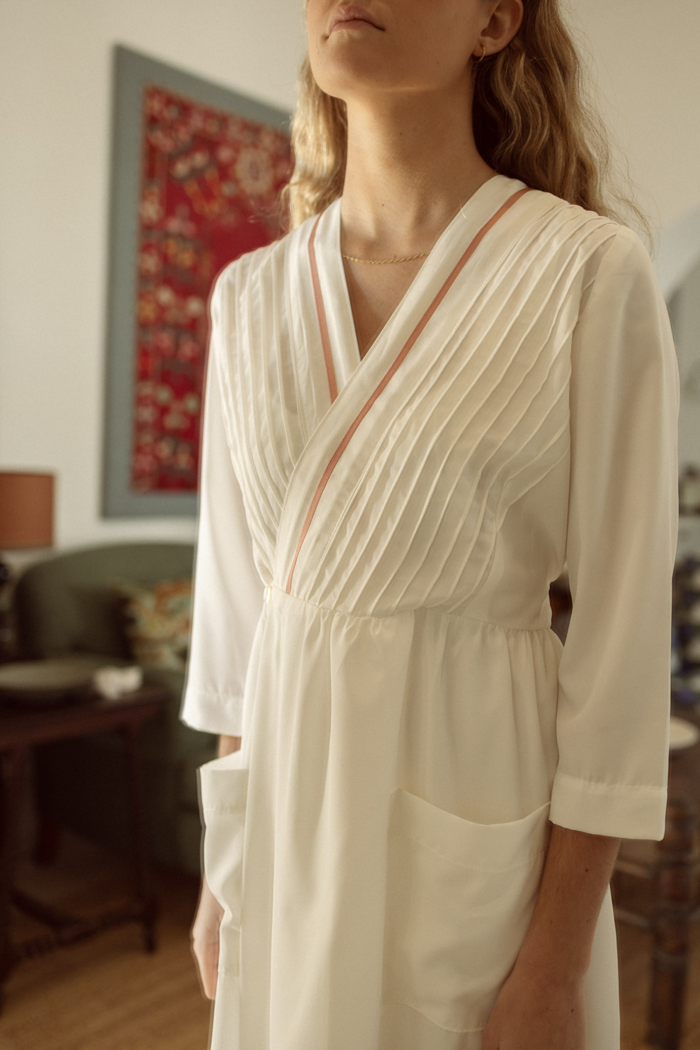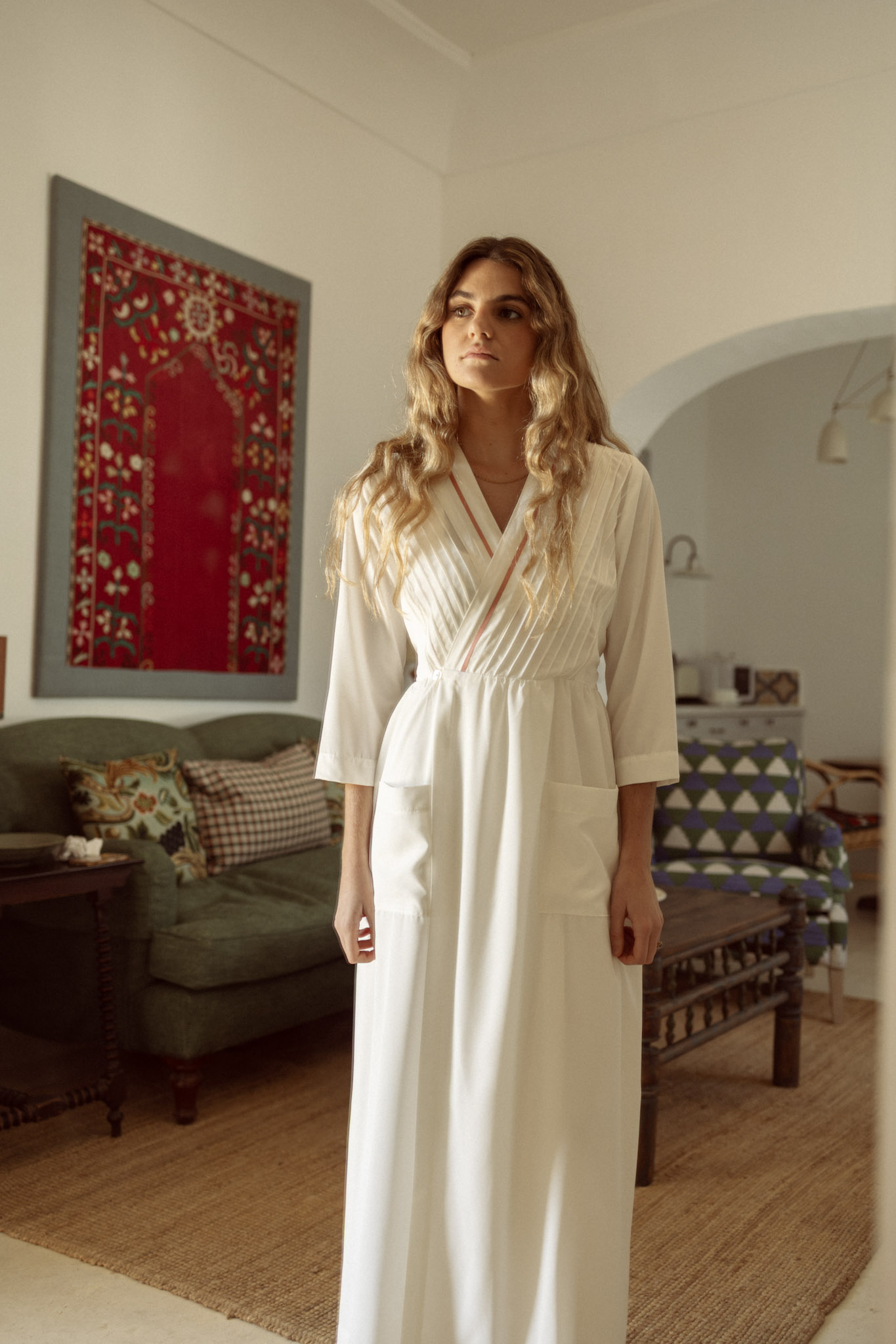 Bata confeccionada en seda de microfibra, un tejido de tacto sedoso y caída fluida que resiste las arrugas. El diseño destaca por su pechera adornada con jaretas plisadas diagonales que se cruzan en el delantero, aportando una textura sofisticada y elegante. Presenta un cierre cruzado enmarcado por una delicada cinta de falla rosa en contraste, que actúa como ribete decorativo a lo largo del escote en V. Incorpora mangas francesas (3/4) que terminan con un acabado limpio, y dos prácticos bolsillos de parche delanteros funcionales. La espalda incluye un lazo a la altura de la cintura, asegurando un ajuste cómodo para entallar.