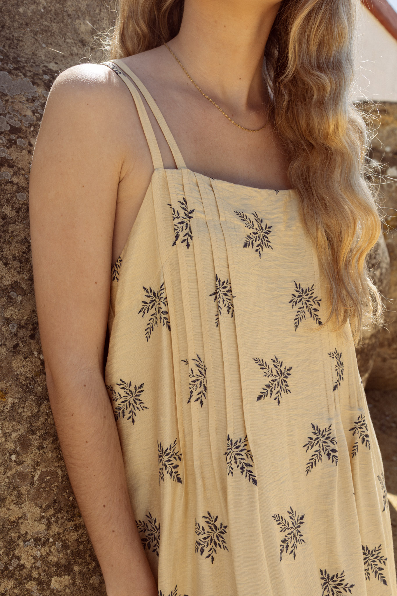 Este camisón de tirantes destaca por su espectacular caída y un punto sedoso de tacto frío. Su diseño luce un luminoso fondo amarillo con un estampado botánico azul marino que recorre toda la pieza. Presenta un elegante escote recto con tirantes dobles idénticos en el delantero y en su espalda alta. El frontal incorpora tablas verticales que aportan un sutil volumen, mientras que las tres pinzas traseras definen la silueta con comodidad. Una prenda fresca y sofisticada, perfecta para verano.