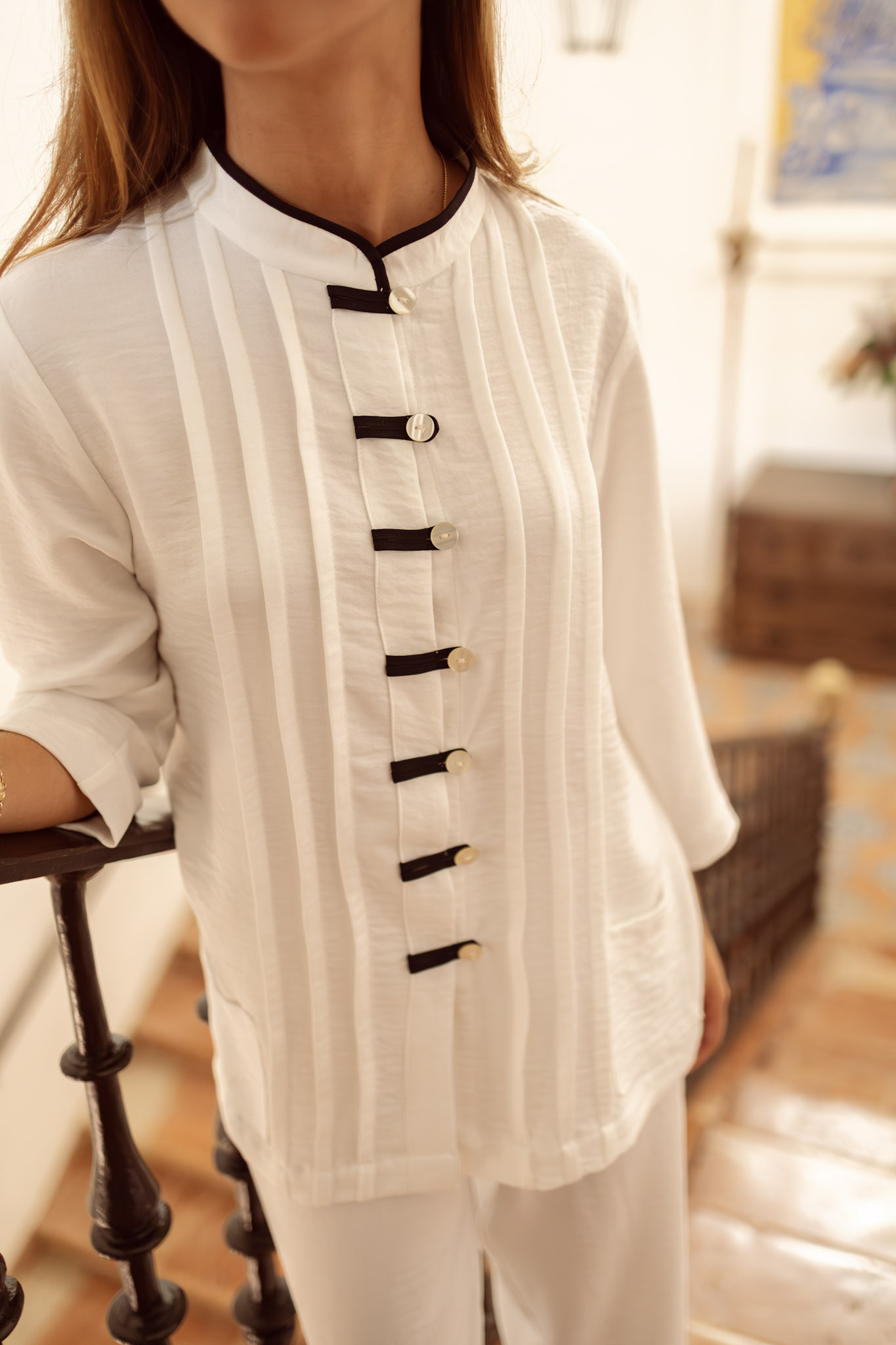 El Pijama Rino está confeccionado en suave viyela con efecto bambula, un tejido cálido y ligero ideal para el invierno. Su diseño destaca por las tablitas en el pecho, el elegante cuello mao con vivo negro y los delicados lazos negros en la abotonadura frontal. Con manga larga y un corte cómodo, es una prenda que combina la elegancia clásica con la comodidad del día a día, perfecta para descansar con estilo.
